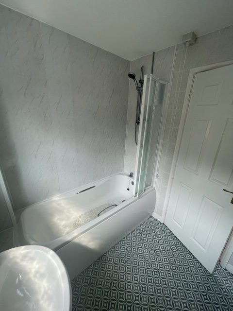 Stylish Family Bathroom Suite with Tiled & Panelled Walls and Electric Shower over the Bath