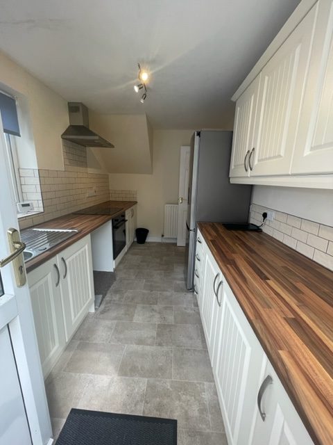 Modern Cream Shaker Style Fitted Kitchen with High & Low Units, Tiled Splashback and Vinyl Flooring. Integrated Appliances include: