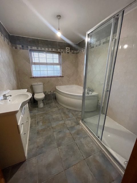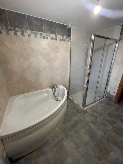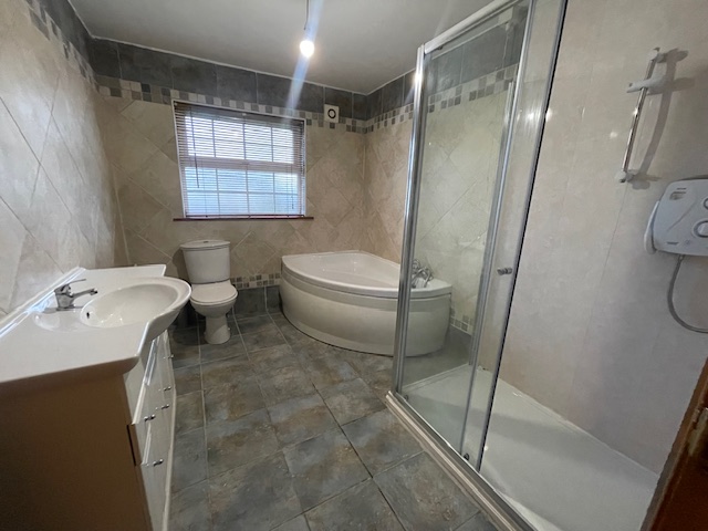 Stylish Fully Tiled Family Bathroom Suite with separate corner bath and large walk in Shower with Electric Shower