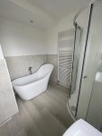 > Stylish Brand New Family Bathroom Suite with Large Walk in Mains Shower and Separate Free Standing Bath with wood affect flooring