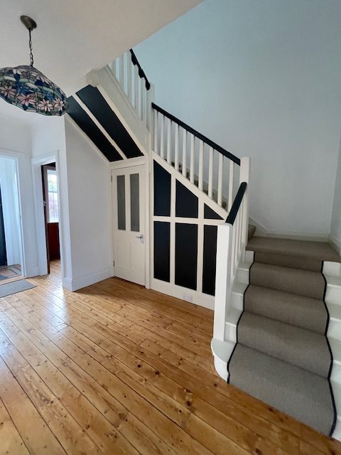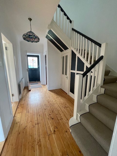 > Open and Bright Entrance Hallway with original flooring, High Ceilings and open staircase leading to spacious Landing