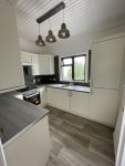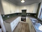 > Brand New Modern Cream Shaker Style Kitchen with High & Low Units, Tiled Splashback, Wood affect vinyl flooring and Integrated Appliances including:
