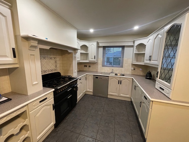 Modern Grey Coloured Solid Wooden Kicthen & Dining Area with High & Low Units, Tiled Flooring and Tiled Splashback and Integrated Appliances including: