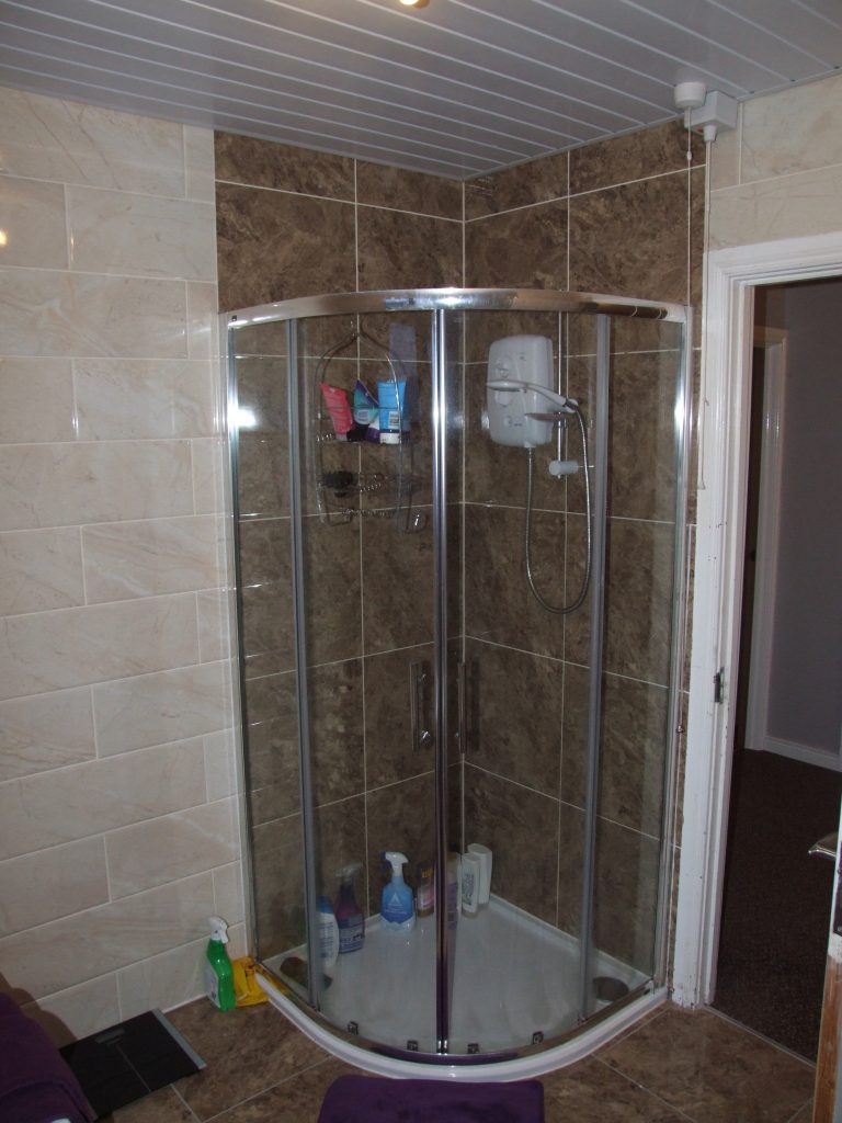 Fully Tiled Stylish Family Bathroom Suite with Separate Bath and Walk in Electric Shower