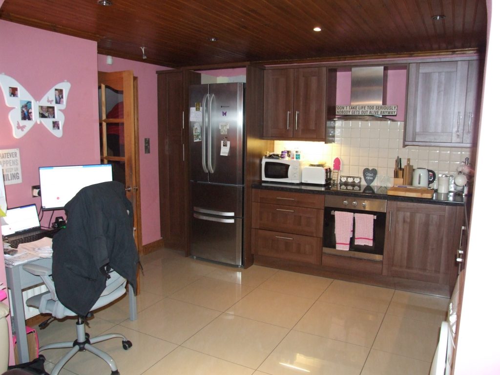 Dark Walnut Fitted Kitchen with High & Low Units. Tiled Flooring and Splashback and appliances including: