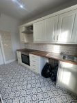 Modern Galley Kitchen with Cream Shaker Style High & Low Kitchen Units, Tiled Splashback, Vinyl Flooring and appliances including: