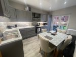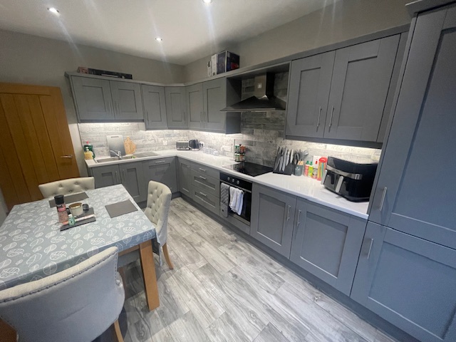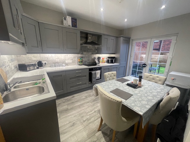 Modern Grey Coloured Fitted Kitchen & Dining Area with High & Low Units, Tiled Flooring and Tiled Splashback. Double Patio Doors Leading to Rear Garden. Integrated appliances including: