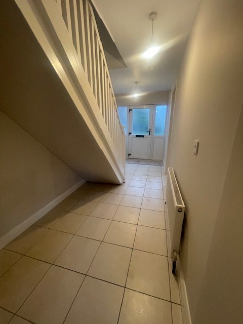 Bright Entrance Hallway with Tiled Flooring and storage area underneath the stairs