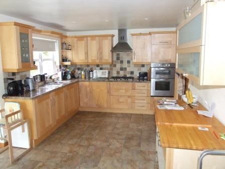 Modern Beech Style Fitted Kitchen with High & Low Storage Units & Tiled Flooring. Integrated Appliances include: