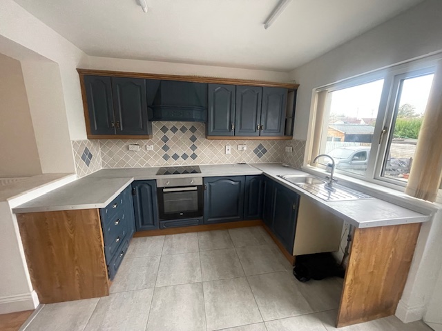 Solid Wooden Kitchen recently repainted with High & Low Units, Tiled Flooring and Splashback and Appliances including: