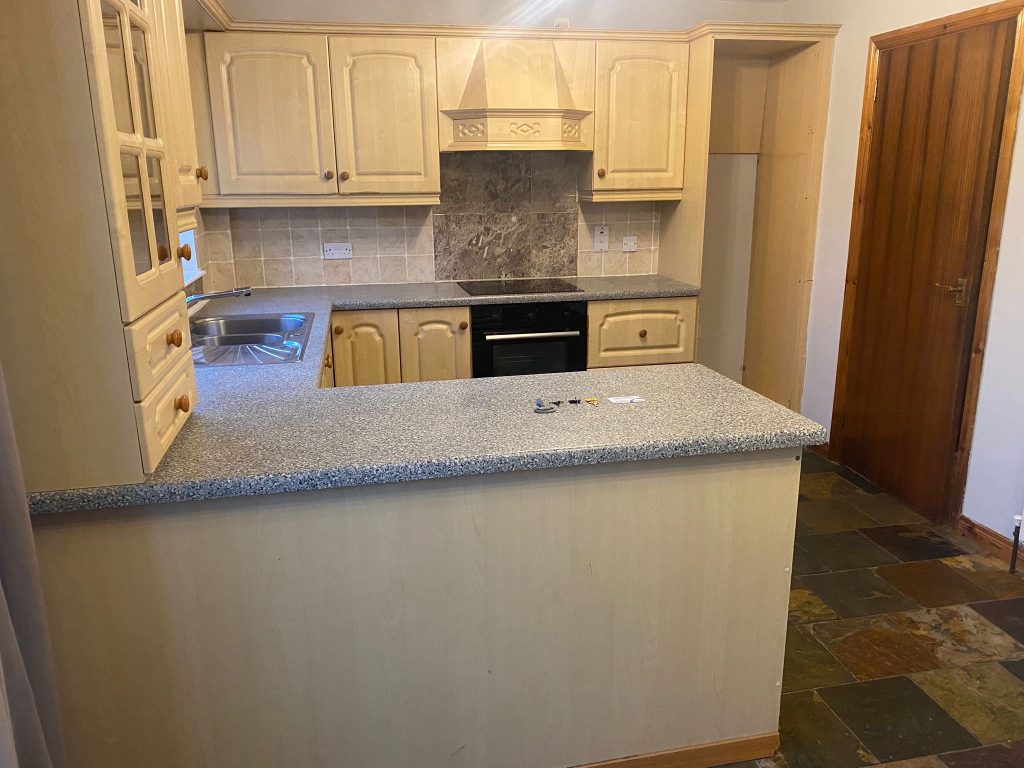 Modern fitted kitchen with High & Low Units, Slate Affect Tiling & Breakfast Bar. Integrated Appliances include: