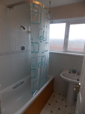 Stylish White Bathroom Suite, Partially Tiled Walls, Vinyl Flooring and Mains Shower over the bath