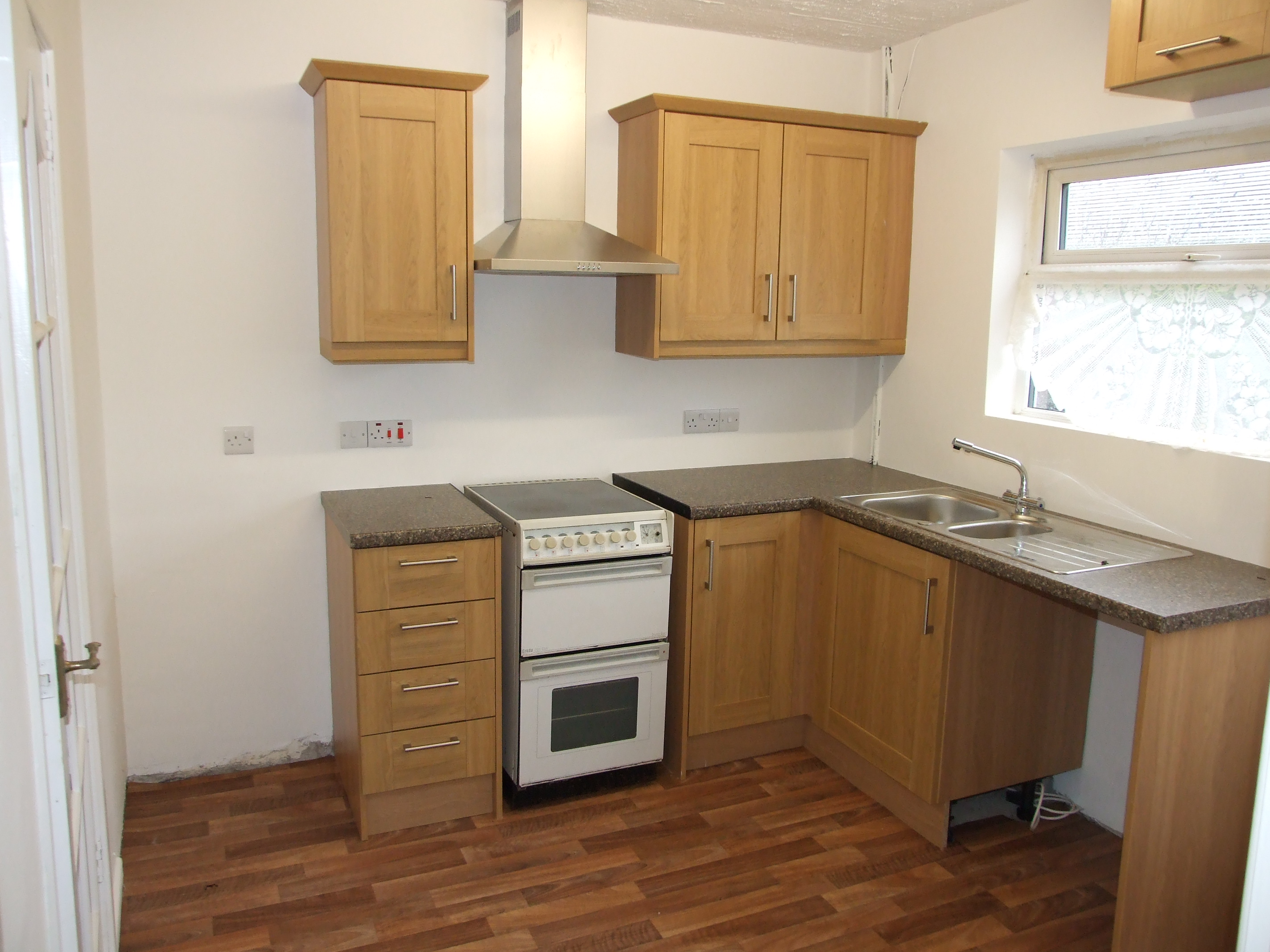 Modern & New Light Oak Fitted Kitchen with High & Low Units and Vinyl Flooring. Electric Oven & Hob Supplied. No other appliances are included.