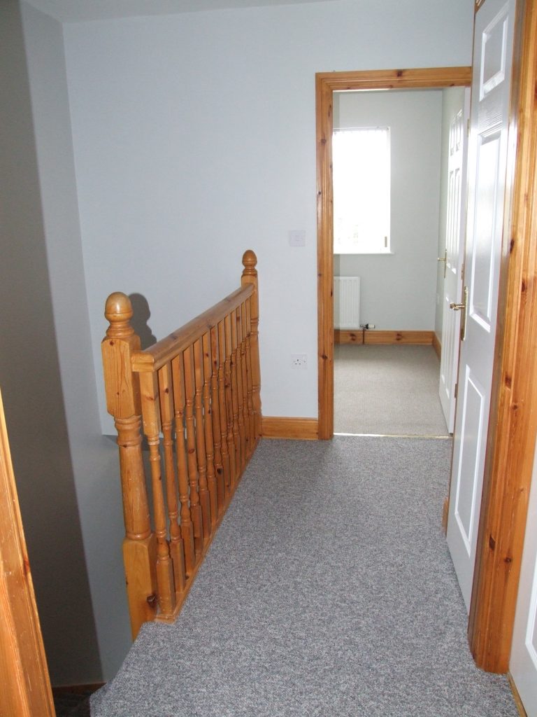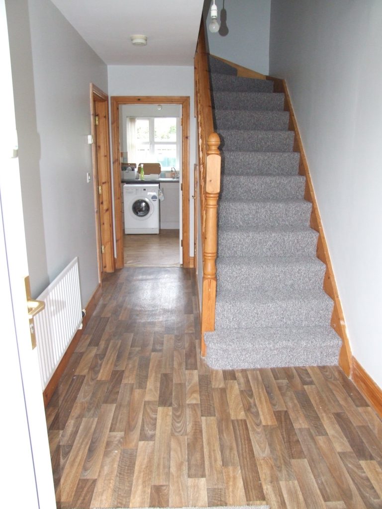 Bright Entrance Hall with wood effect vinyl flooring leading to carpeted Stairs with under stair storage