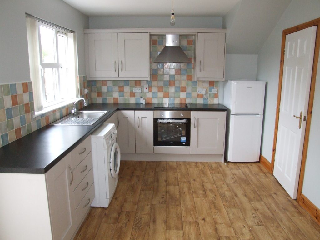 Modern Grey Coloured Shaker Style Kitchen & Dining Area with High & Low Units, Wood effect vinyl flooring, and Integrated Appliances including: